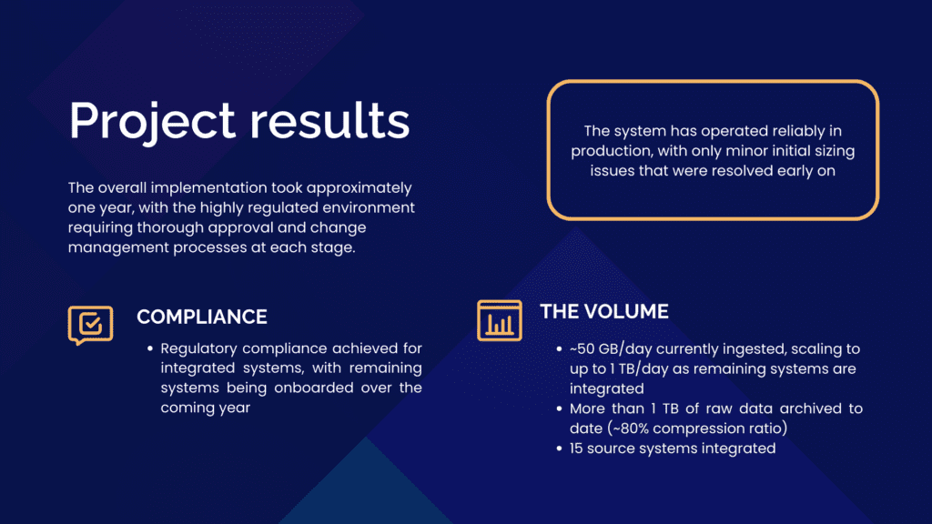 The result is not only regulatory compliance. Our client gets improved security posture, centralized log governance, and a scalable log management architecture that supports hybrid and cloud environments.