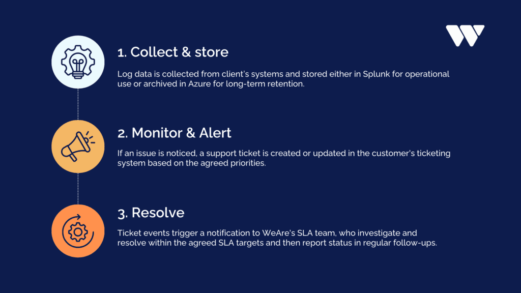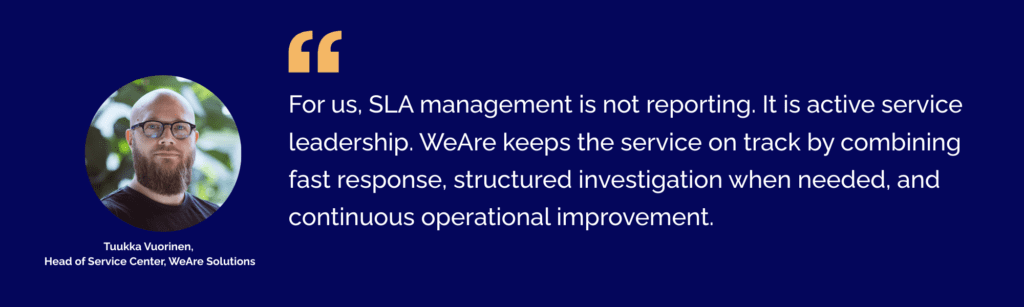 - WeAre introduced structured SLA monitoring through our Service Center operating model, built on Splunk expertise, with clear response practices and disciplined operational follow-up inside the customer’s environment.