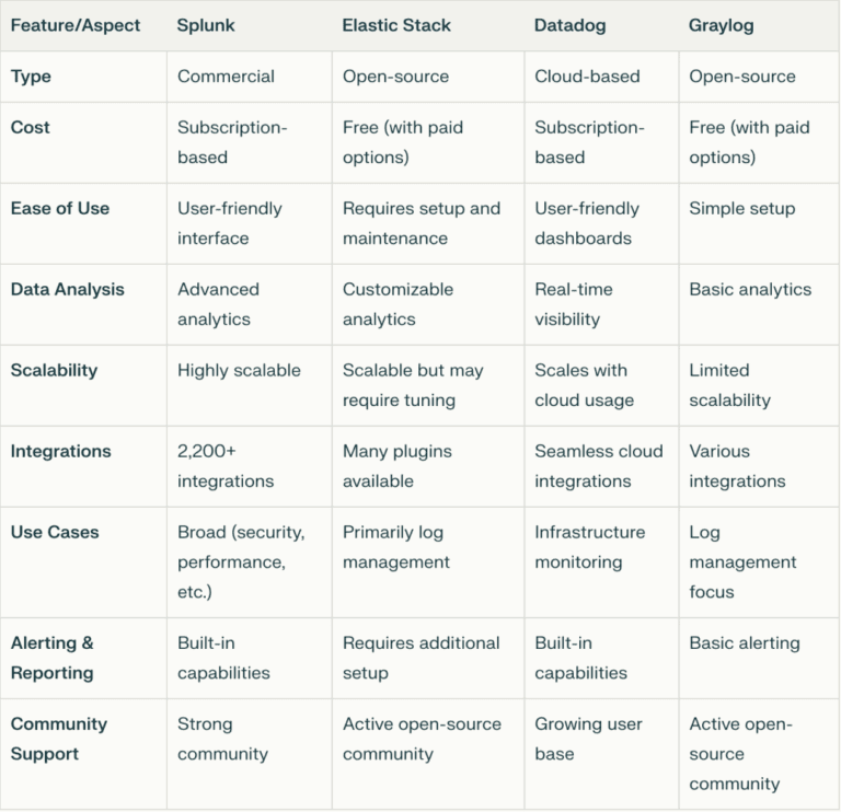 Besides Splunk, there are other log management tools such as Datadog, Graylog, and Elastic Stack. Below is the comparison table which highlights that Splunk is ideal for enterprises needing comprehensive log management with advanced features and scalability.